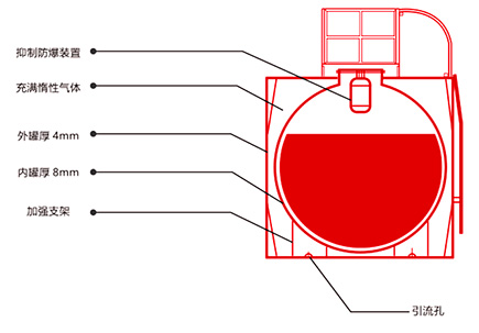 由于罐体外部着火受热,罐体内部加装惰性气体燃烧抑制防爆装置,随着温度的升高,达到一定温度的惰性气体满足温控启动装置,从而达到抑爆防爆功能。